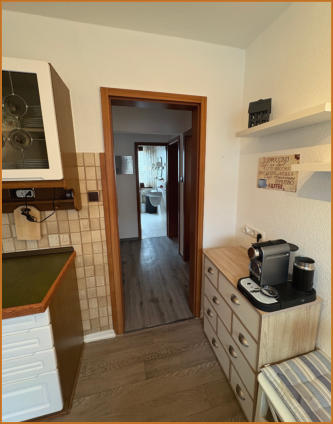 aus einem Wohnzimmer mit Balkon, einer Küche mit